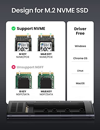 Specification: UGREEN M.2 NVMe PCIE SSD Behuizing USB C 3.1 Gen 2 10Gbps UASP, M Key en M&B Key NVME M.2 Behuizing Compatibel met 2230…