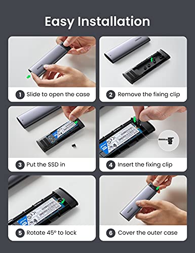 Zonder Gereedschap: Vergeleken met de moeilijke installatie met schroeven en schroevendraaiers, duurt de installatie met de UGREEN USB NVMe M2 adapter slechts enkele seconden: schuif gewoon de metalen afdekking, plaats de harde schijf en zet deze vast met het meegeleverde slot. U hoeft zich dus geen zorgen te maken dat u de kleine schroeven kwijtraakt en afscheid neemt van omslachtige veranderingen en installatie.