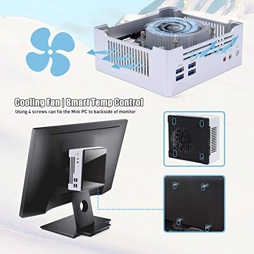 【Draagbaar en ingebouwd ventilatorontwerp】 Afmetingen minicomputer: 15,0 x 13,7 x 6,5 cm (5,91 * 5,39 * 2,56 inch), onze mini-desktop-pc is zeer compact, ruimtebesparend en draagbaar. Kleine Mini PC uitgerust met een goed koelsysteem en een geluidsarme ventilator. Onze mini PC is een snel afkoelende, geventileerde computer met een behuizing van geborsteld metaal en kunststof. Deze grafische desktopcomputer heeft een uitstekende robuustheid en warmteafvoer.